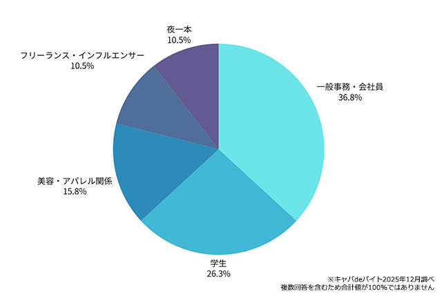 また、他のアルバイトと掛け持ちしている方も多く、 ナイトワーク専業の方は意外と少なめ。